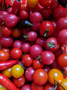 We’ve had more tomatoes than we’ve ever had before – red, orange, yellow, striped, cherry, plum and beefsteak (a selection is pictured below and includes a few chillies). One tomato plant, rescued from the DIY centre chuck-out for 50p, is currently laden with 20 slowly-ripening plum tomatoes. We’re hoping the weather stays the right side of blight for the next couple of weeks, and we get to enjoy these fabulous fruits stress-free.